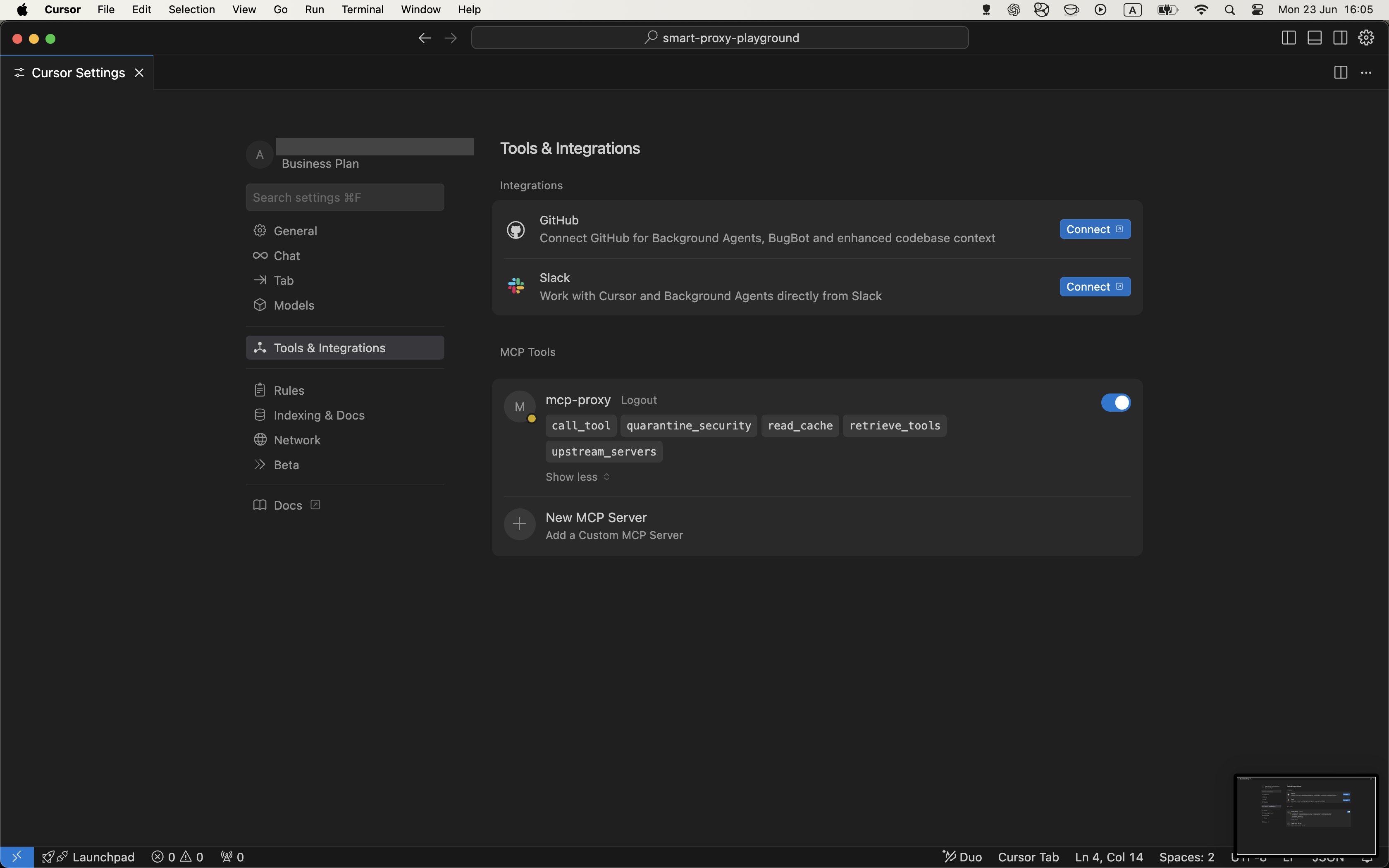 MCPProxy configured in Cursor IDE MCP settings showing server configuration