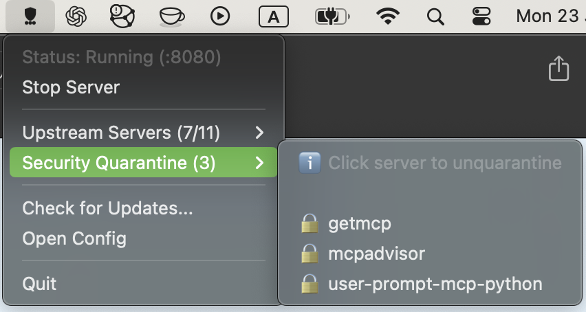 Automatic quarantine system protects against Tool Poisoning Attacks (TPAs) and malicious MCP servers. All new servers are quarantined for security review before activation.