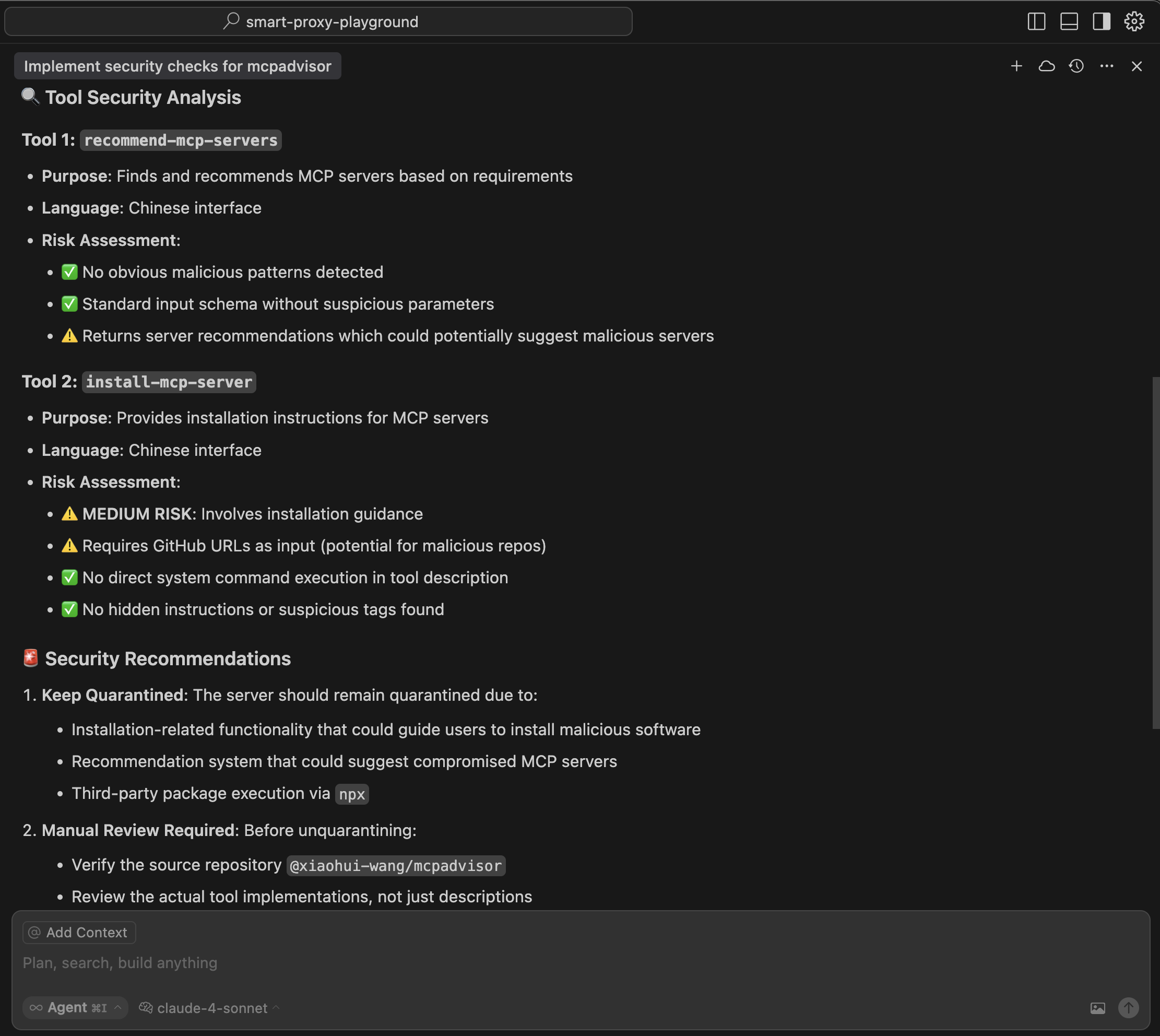 MCPProxy Tool Security Analysis showing detailed security review of MCP tools
